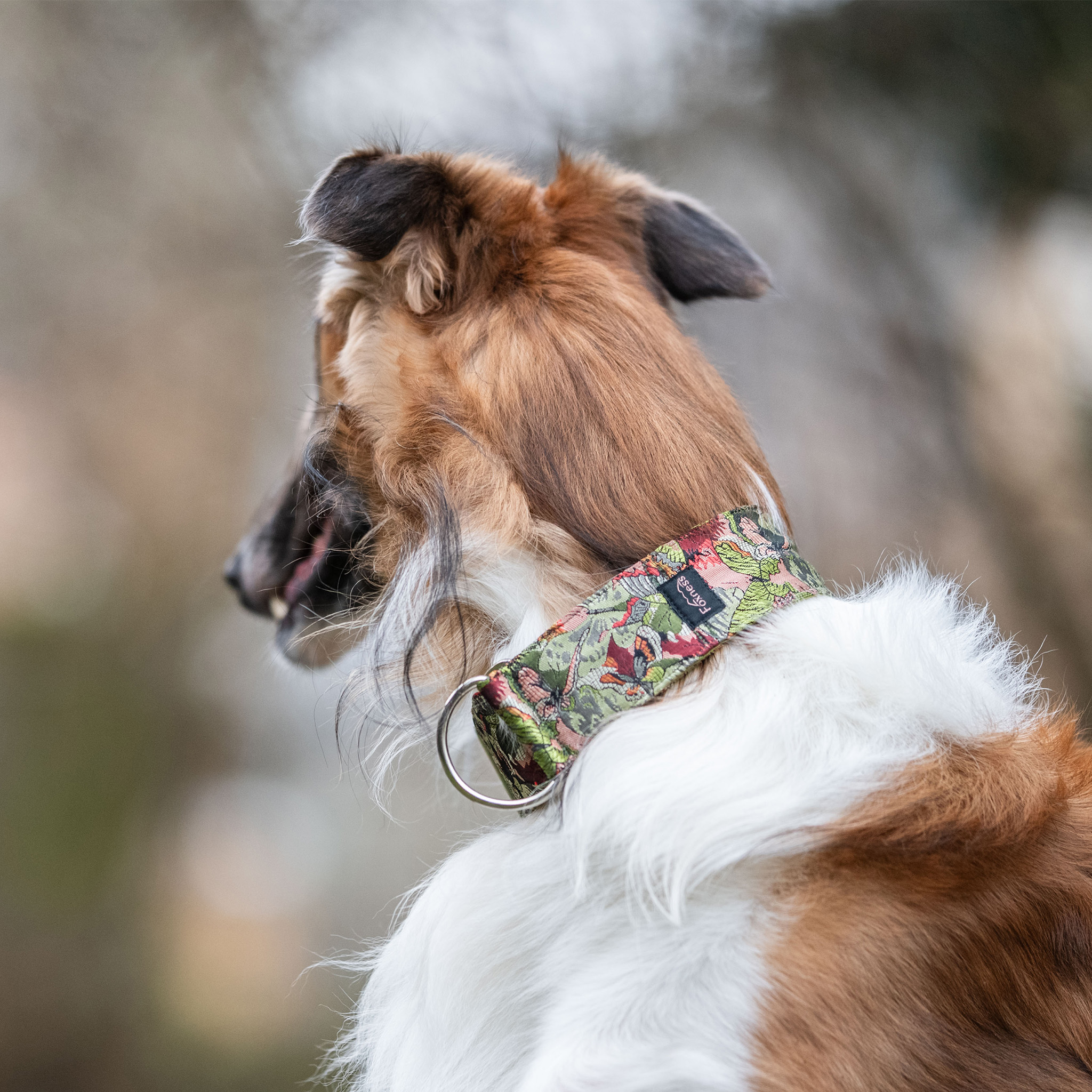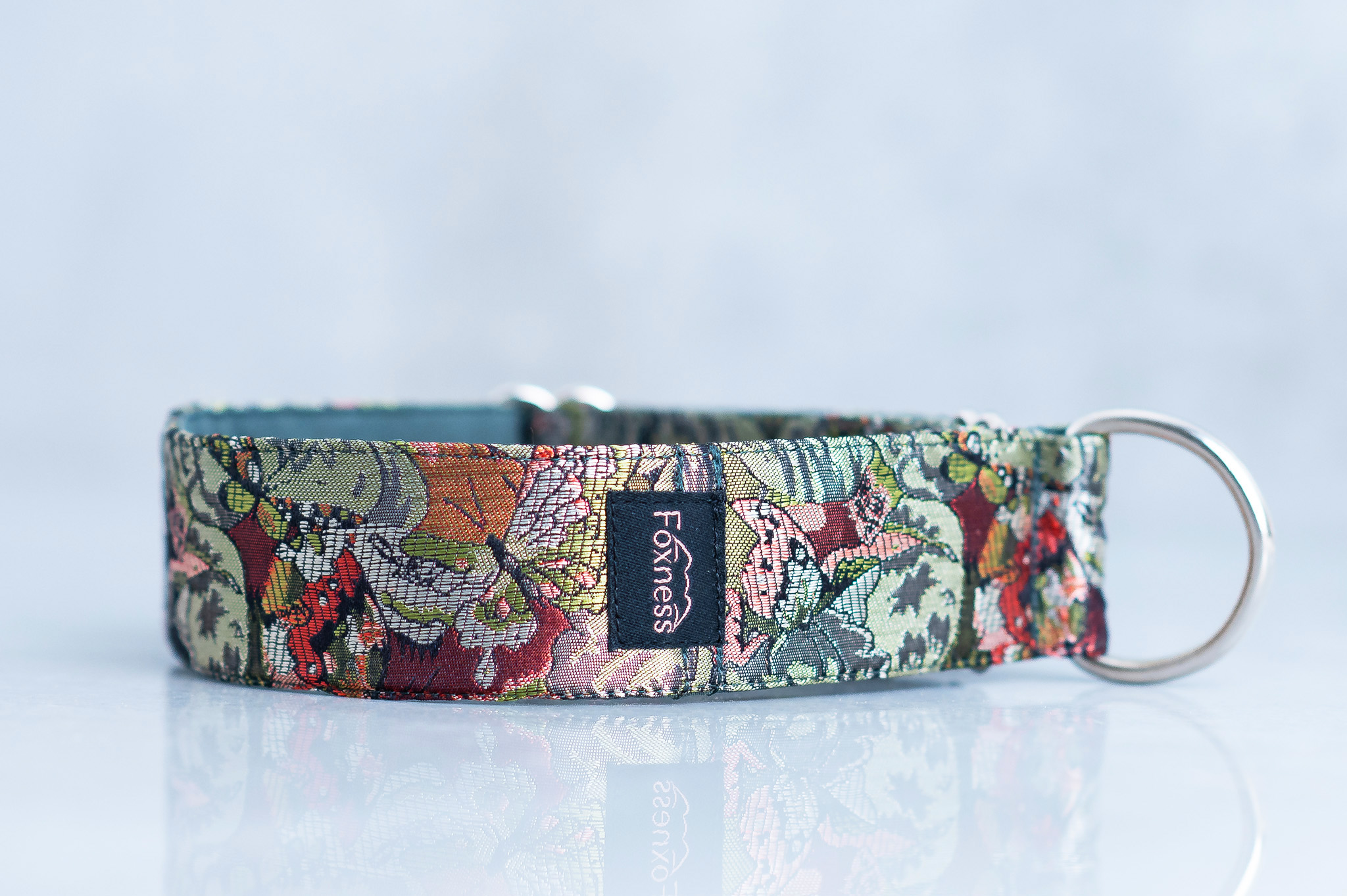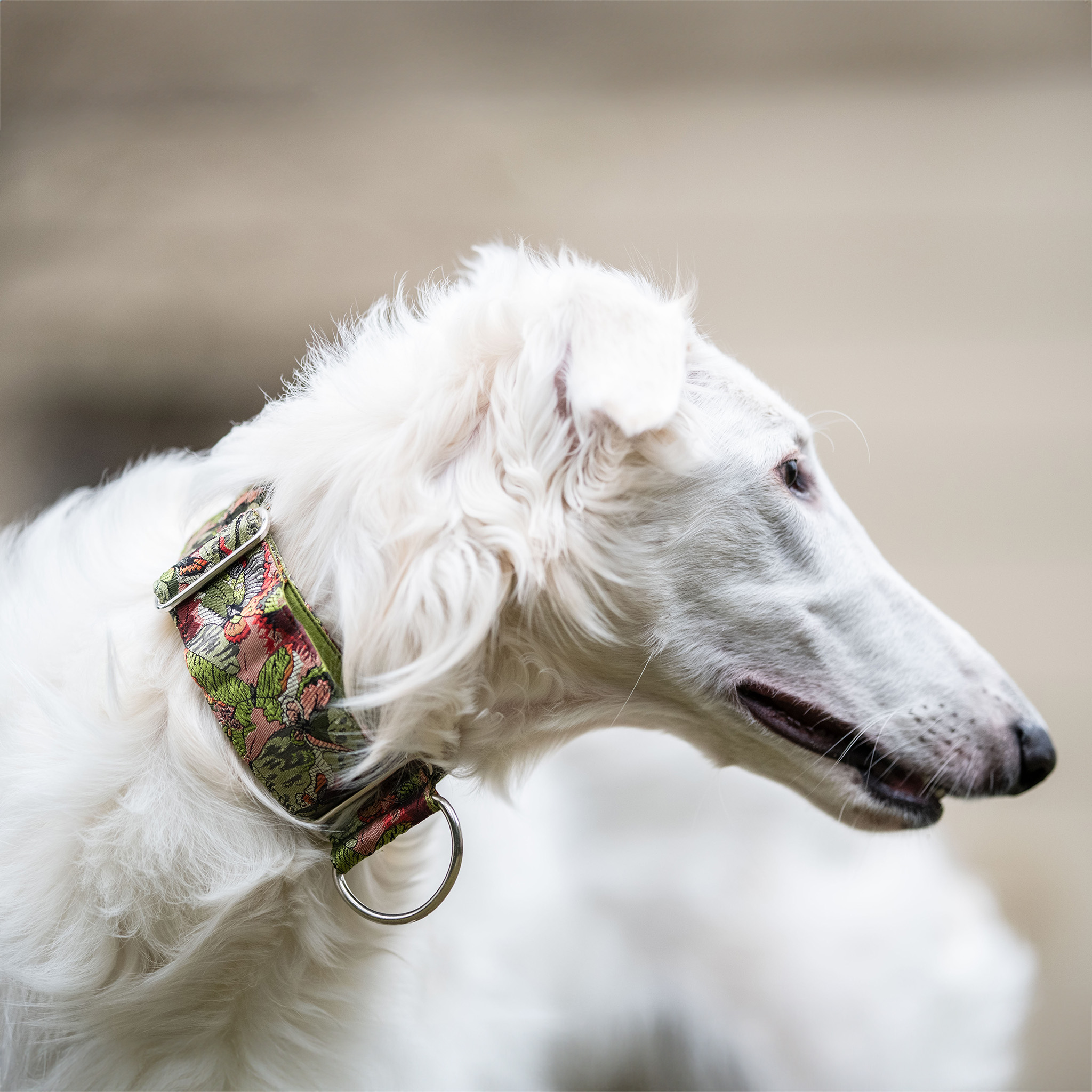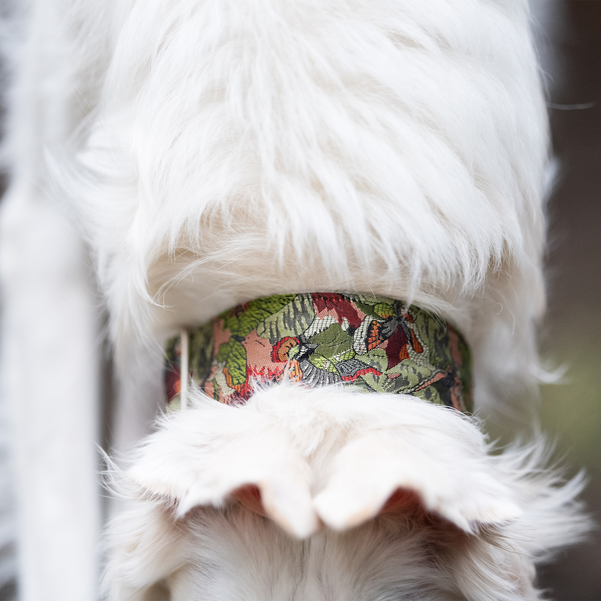 Wykonana z wysokiej jakości tkaniny żakardowej, obroża zachwyca detalami i delikatnym blaskiem. Wewnętrzną część stanowi solidna taśma nośna, odpowiadająca za trwałość i bezpieczeństwo, natomiast całość została obszyta miękkim, bawełnianym materiałem, który przyjemnie układa się na szyi psa i zapewnia wysoki komfort noszenia.
