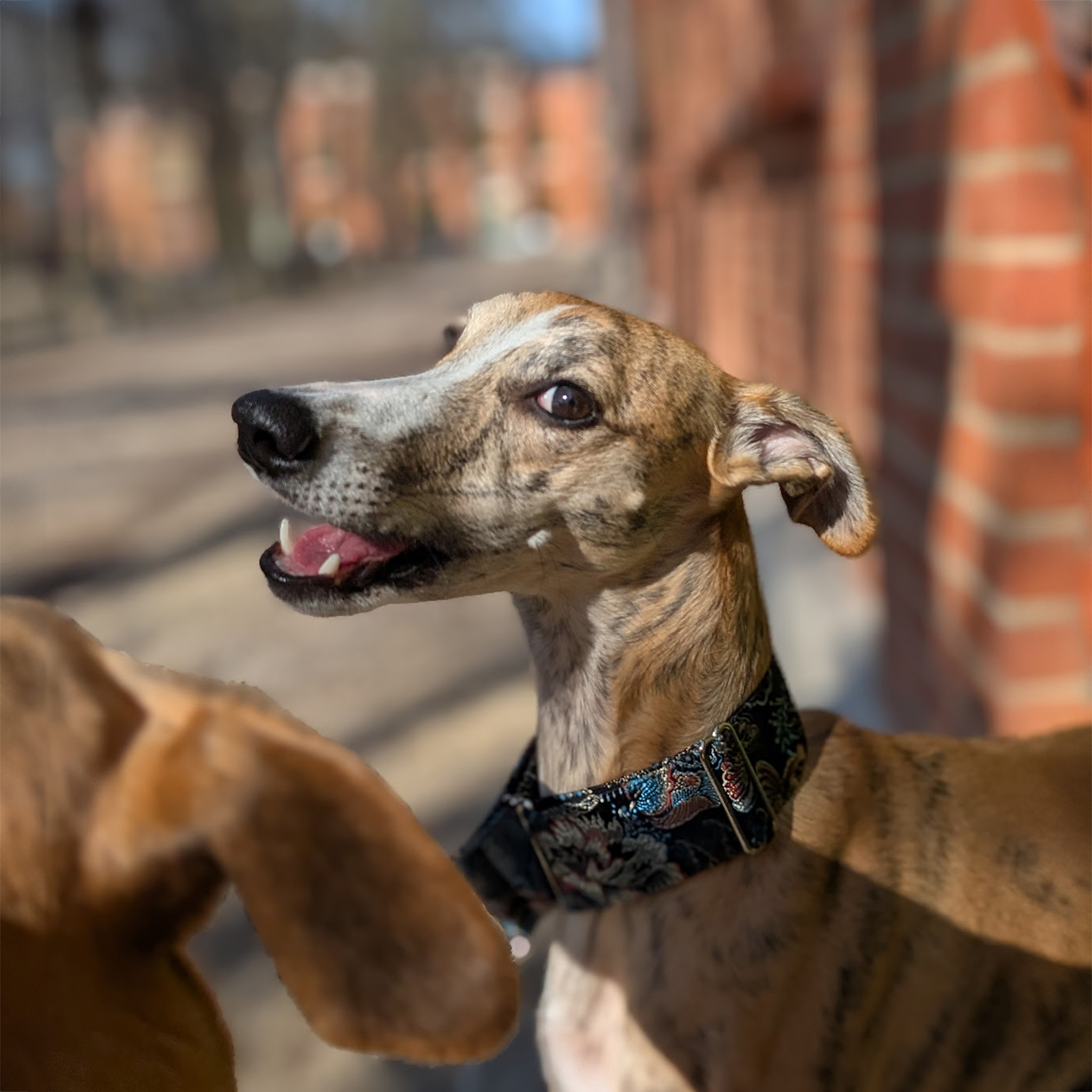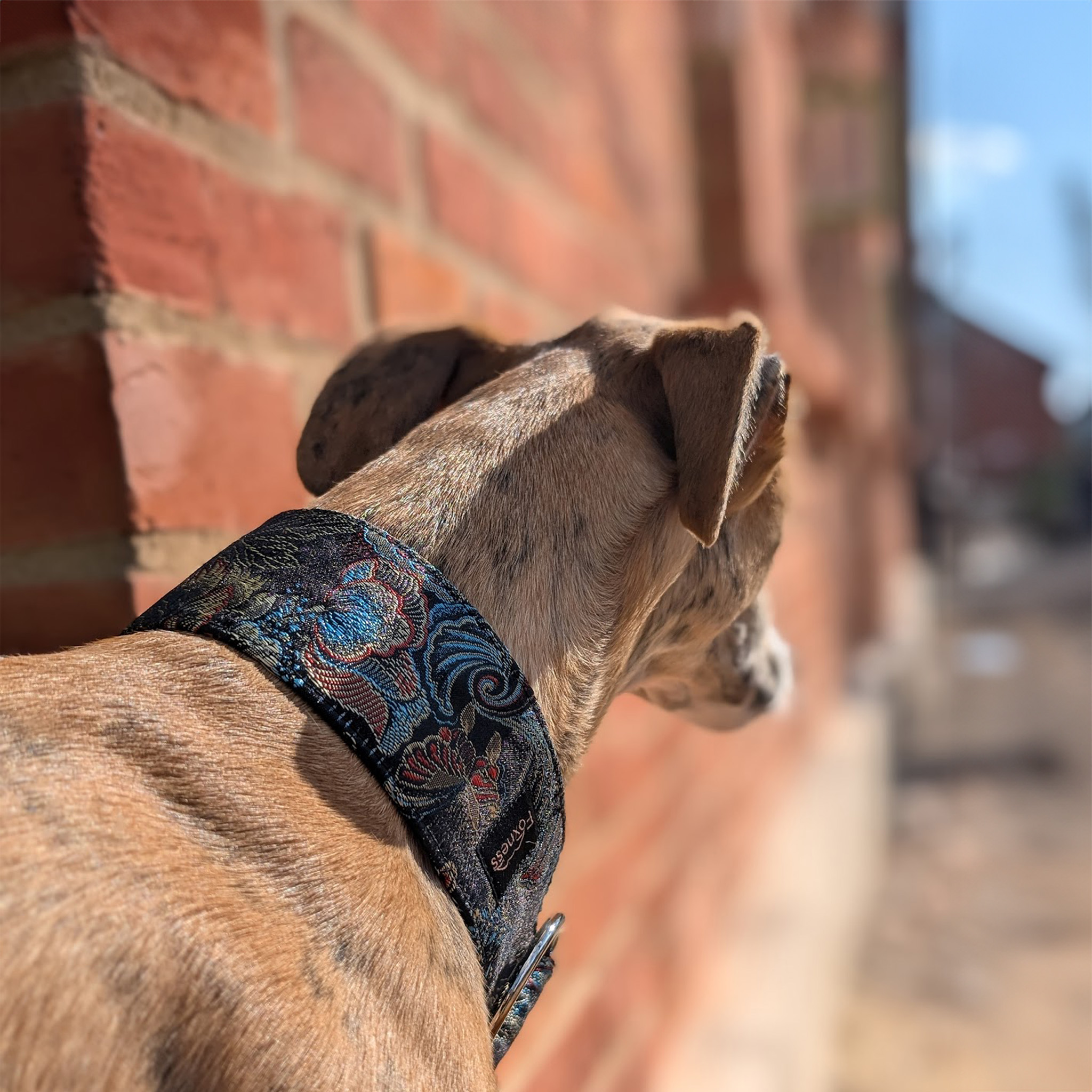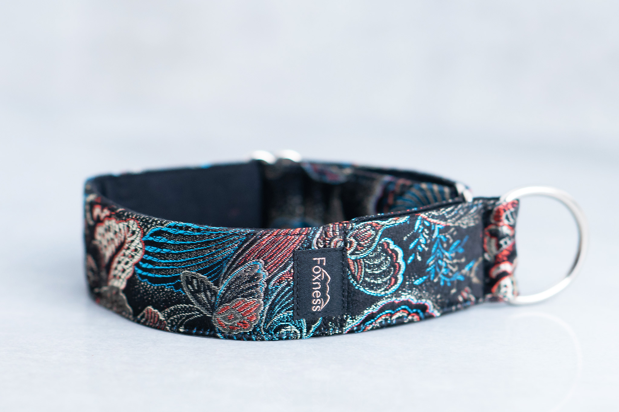 Obroża Nymphalis Antiopa to wyrafinowane połączenie głębokiej czerni i granatu, turkusowych refleksów i subtelnych, czerwonych akcentów, zamkniętych w eleganckiej, dekoracyjnej tkaninie żakardowej. Bogaty, roślinny wzór pięknie mieni się w świetle, nadając obroży biżuteryjnego charakteru i wyjątkowej głębi. To propozycja dla psów, które mają przyciągać spojrzenia – z klasą i bez przesady.