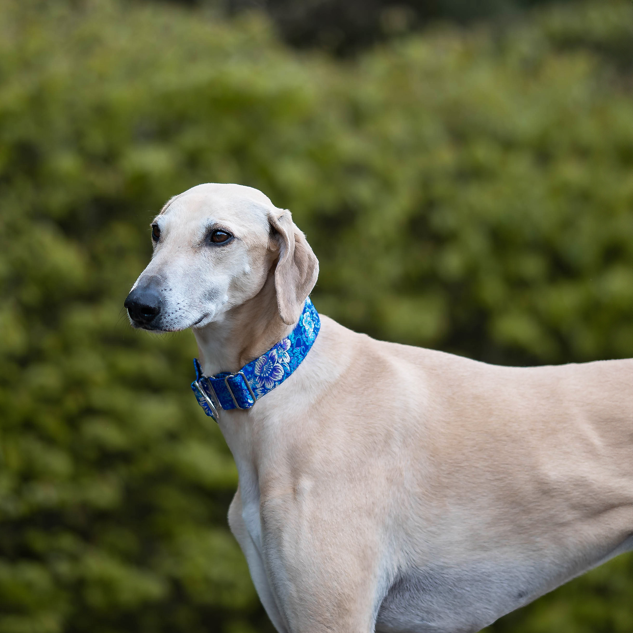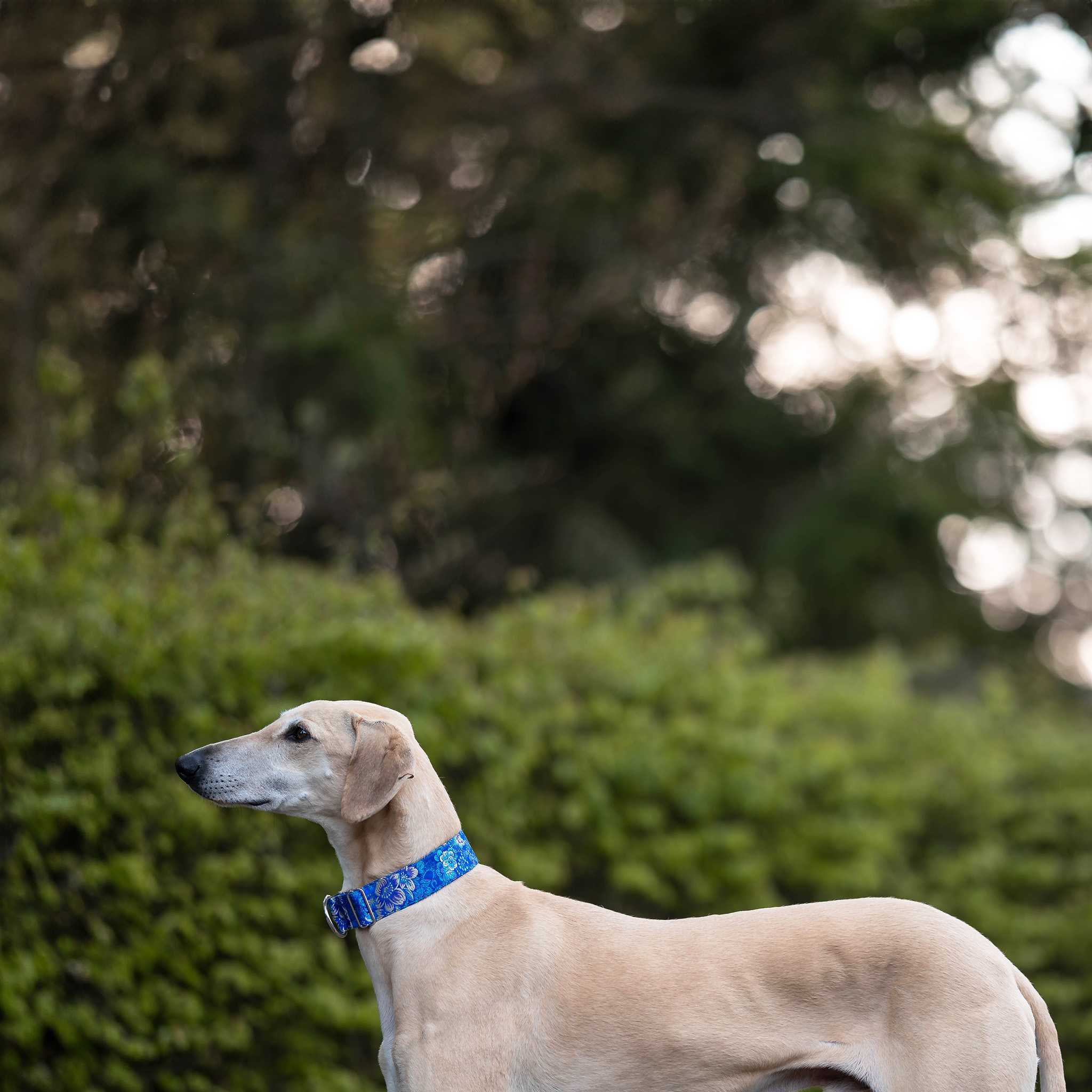 Wykonana z wysokiej jakości tkaniny żakardowej w głębokim, oceanicznym odcieniu, subtelnie mieni się w świetle, podkreślając wyjątkowy charakter psa. Orientalny wzór dodaje jej wyrafinowania i egzotycznego klimatu.