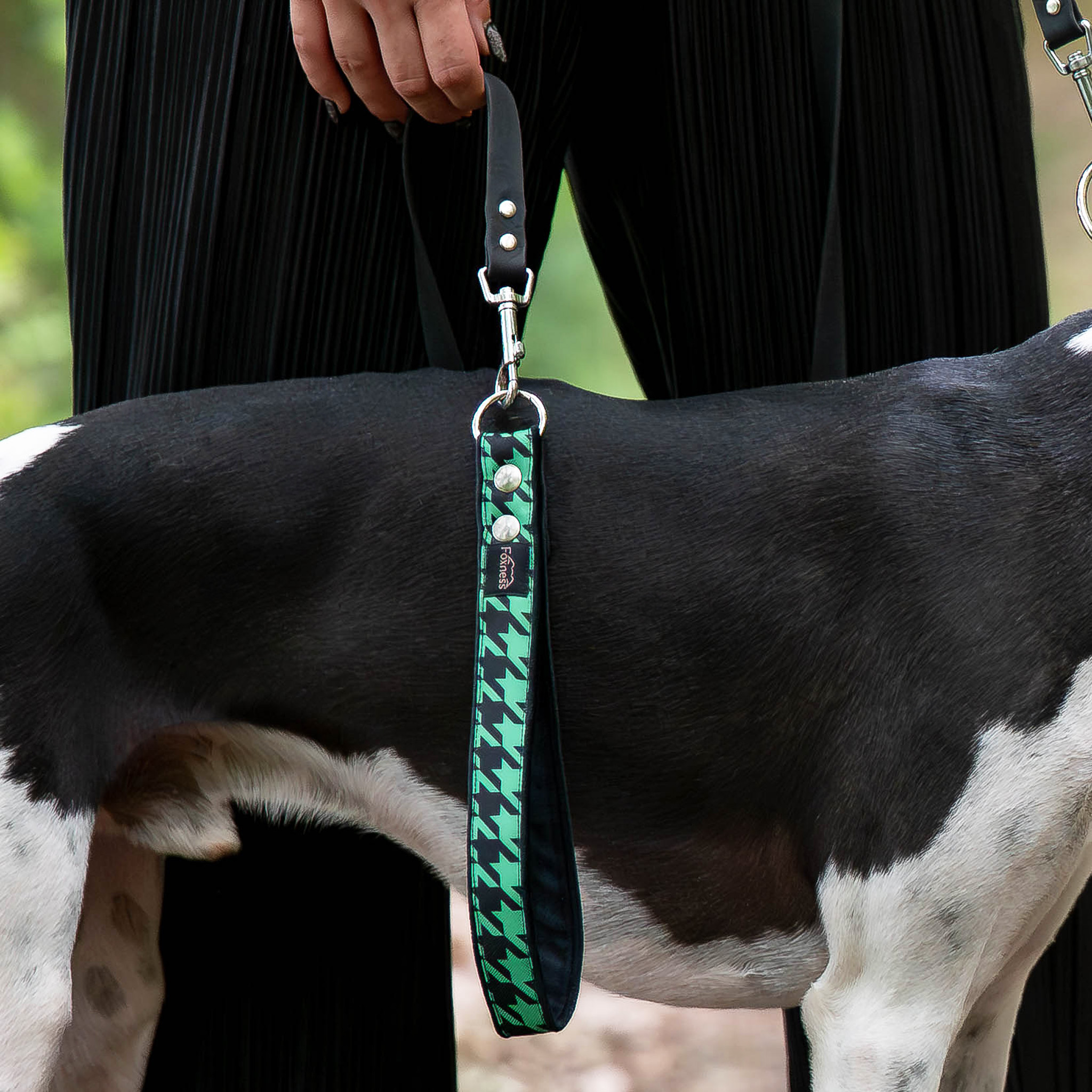 Rączka do smyczy „Green Gossip” to stylowy i praktyczny dodatek, który pozwala stworzyć elegancki, spójny zestaw spacerowy z obrożami z tej samej kolekcji. Wykonana z wytrzymałej, wodoodpornej tkaniny w charakterystyczną zielono-czarną pepitkę, łączy lekkość, wygodę i wyjątkową trwałość - idealna dla psów, które towarzyszą Ci w każdych warunkach.
